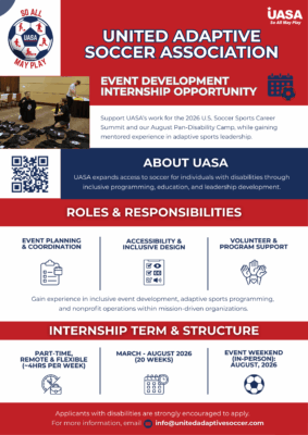 Explore opportunities in Media & Marketing and Event Development, and learn how you can contribute to the growth of adaptive soccer nationwide.