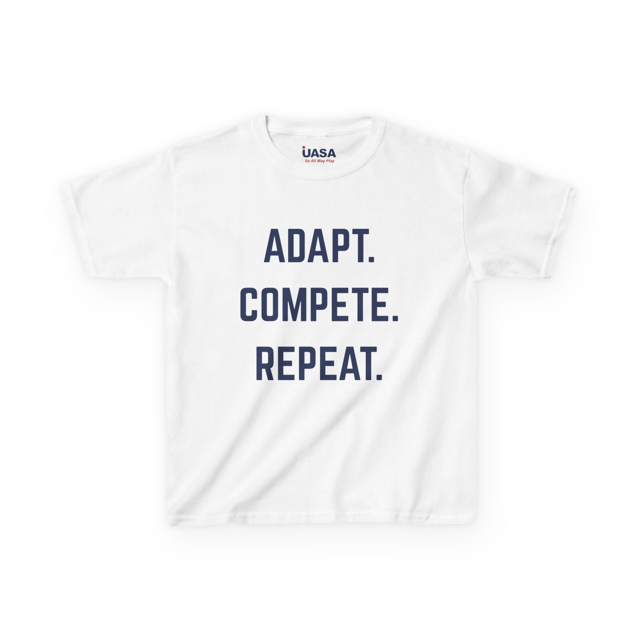 Show your support for adaptive soccer with the UASA Unisex Heavy Cotton Tee in black and white, featuring the tagline ‘ADAPT. COMPETE. REPEAT.’ as featured at the United Soccer Coaches Convention.