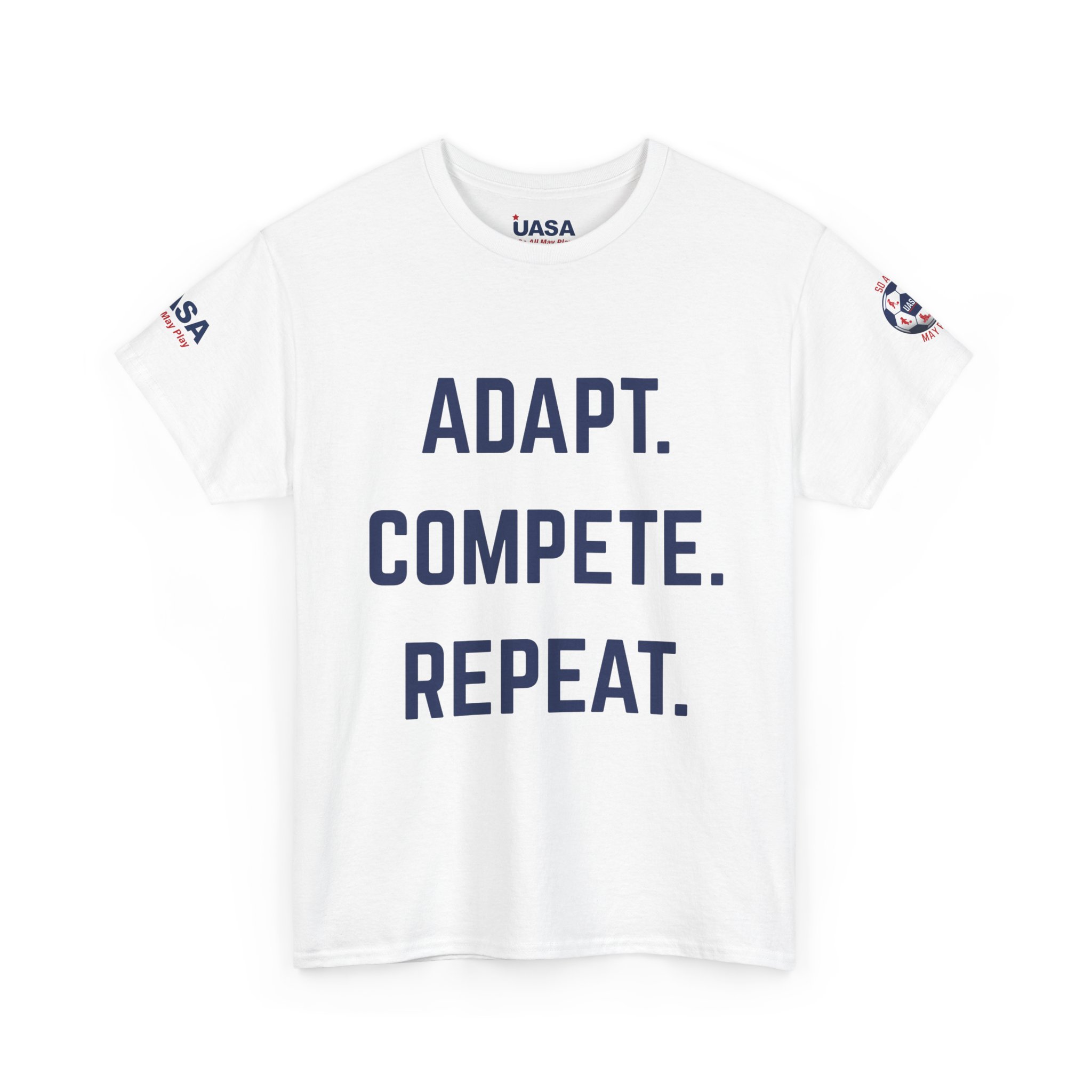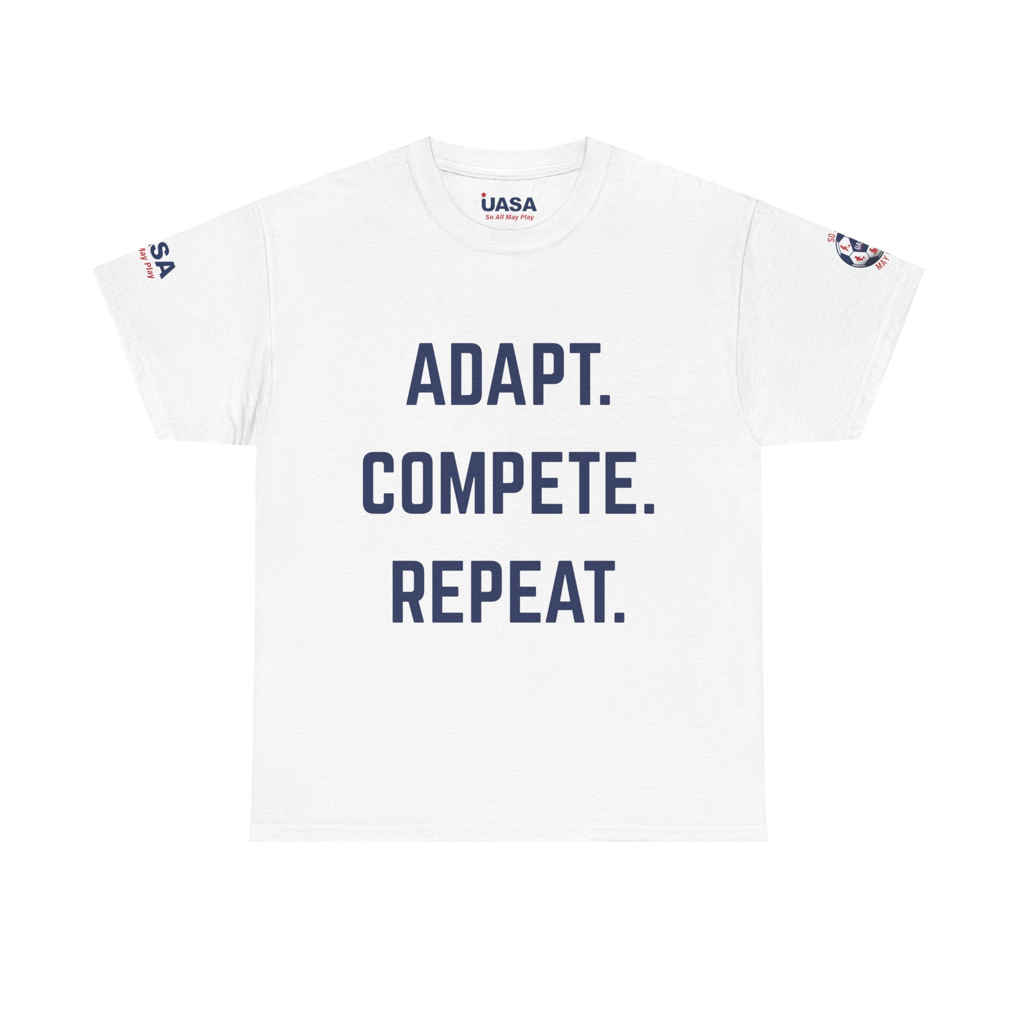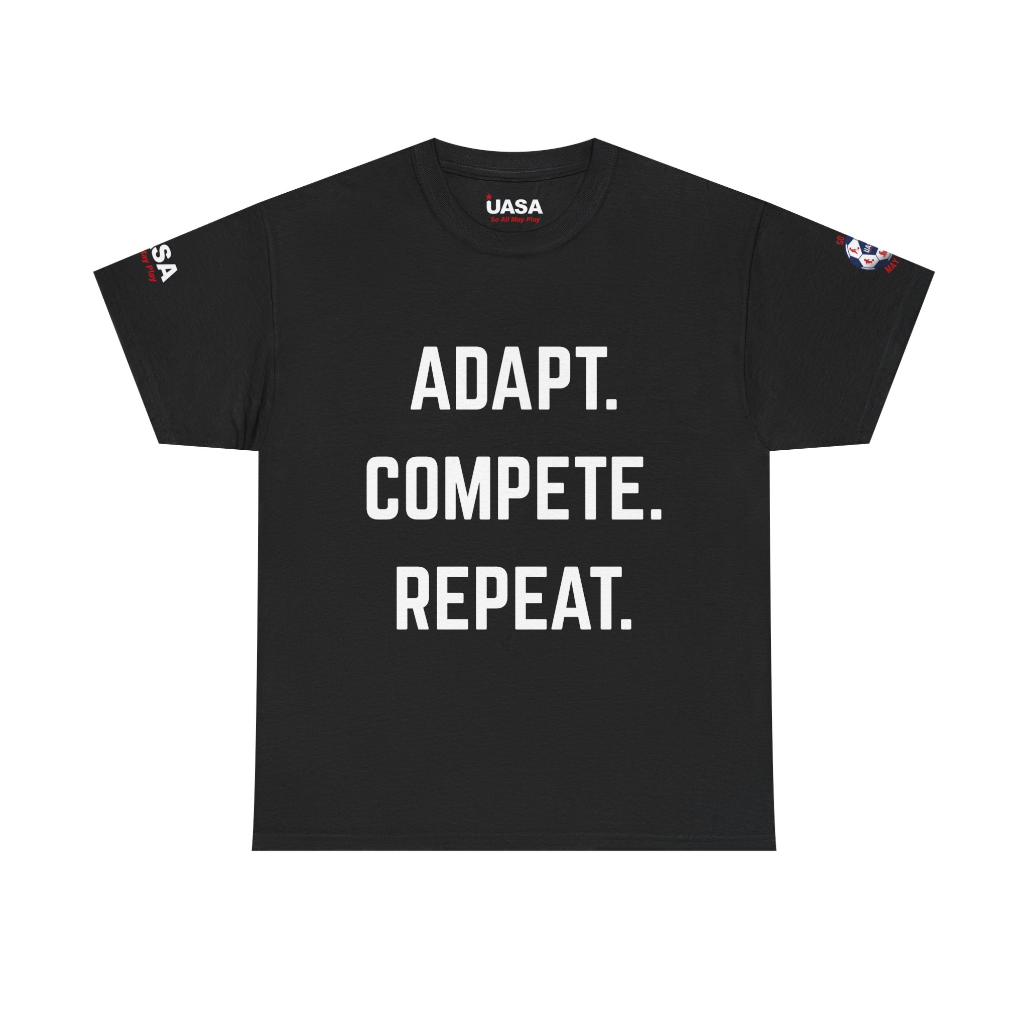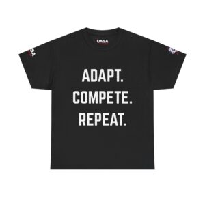 Show your support for adaptive soccer with the UASA Unisex Heavy Cotton Tee in black and white, featuring the tagline ‘ADAPT. COMPETE. REPEAT.’ as featured at the United Soccer Coaches Convention.